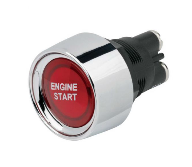 Een heavy-duty 50 amp kortstondige startknop met volledige verlichting, compleet met een gepolijste zilveren rand en een rood centrum. Schroefklemmen aan de achterkant van de schakelaar maken bedrading mogelijk via ringvormige klemmen. Vereist een gat van ongeveer 22 mm in diameter.
