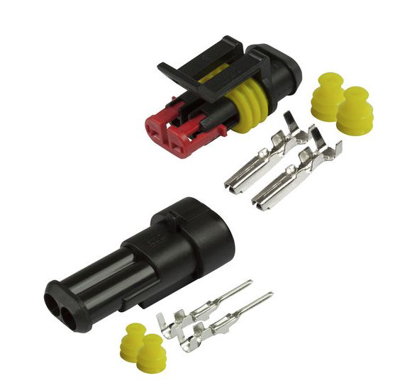 Complete 2-pins set met stekker en contrastekker waarmee het mogelijk is een waterdichte verbinding te creëren tussen twee kabels.